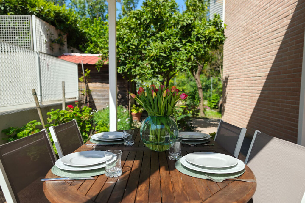 The private garden, enriched with fragrant citrus trees, surrounds the house in an authentic Mediterranean atmosphere, creating a rejuvenating space where nature and tranquility meet.